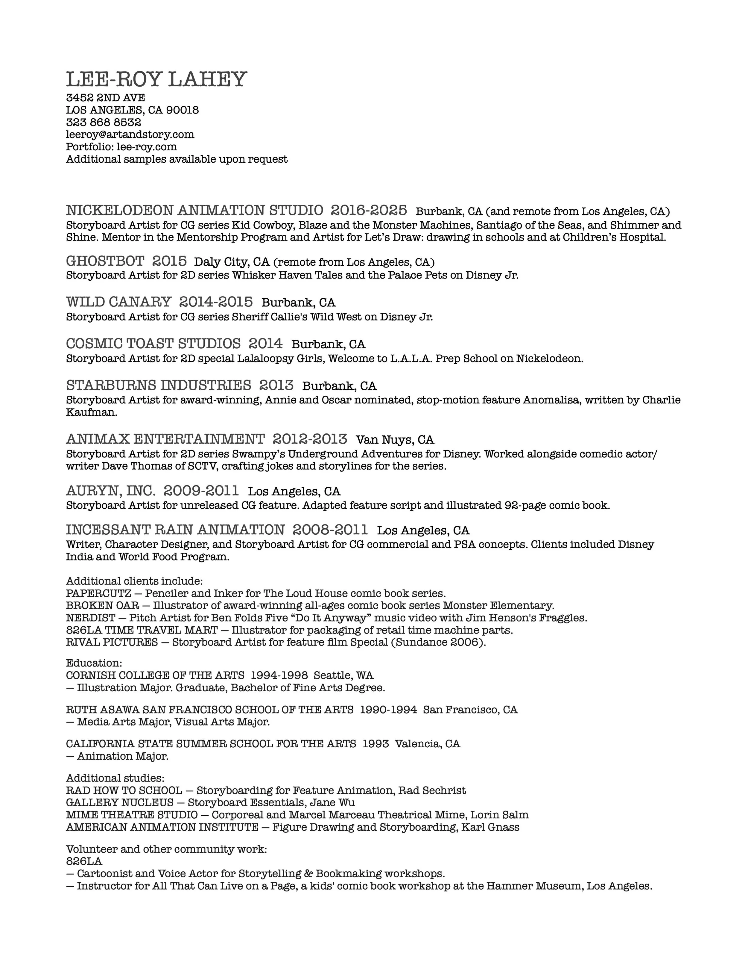 Lee-Roy’s résumé details his extensive experience as a Story Artist in animation, with additional experience in live action storyboards, illustration, comic books, and children’s education.